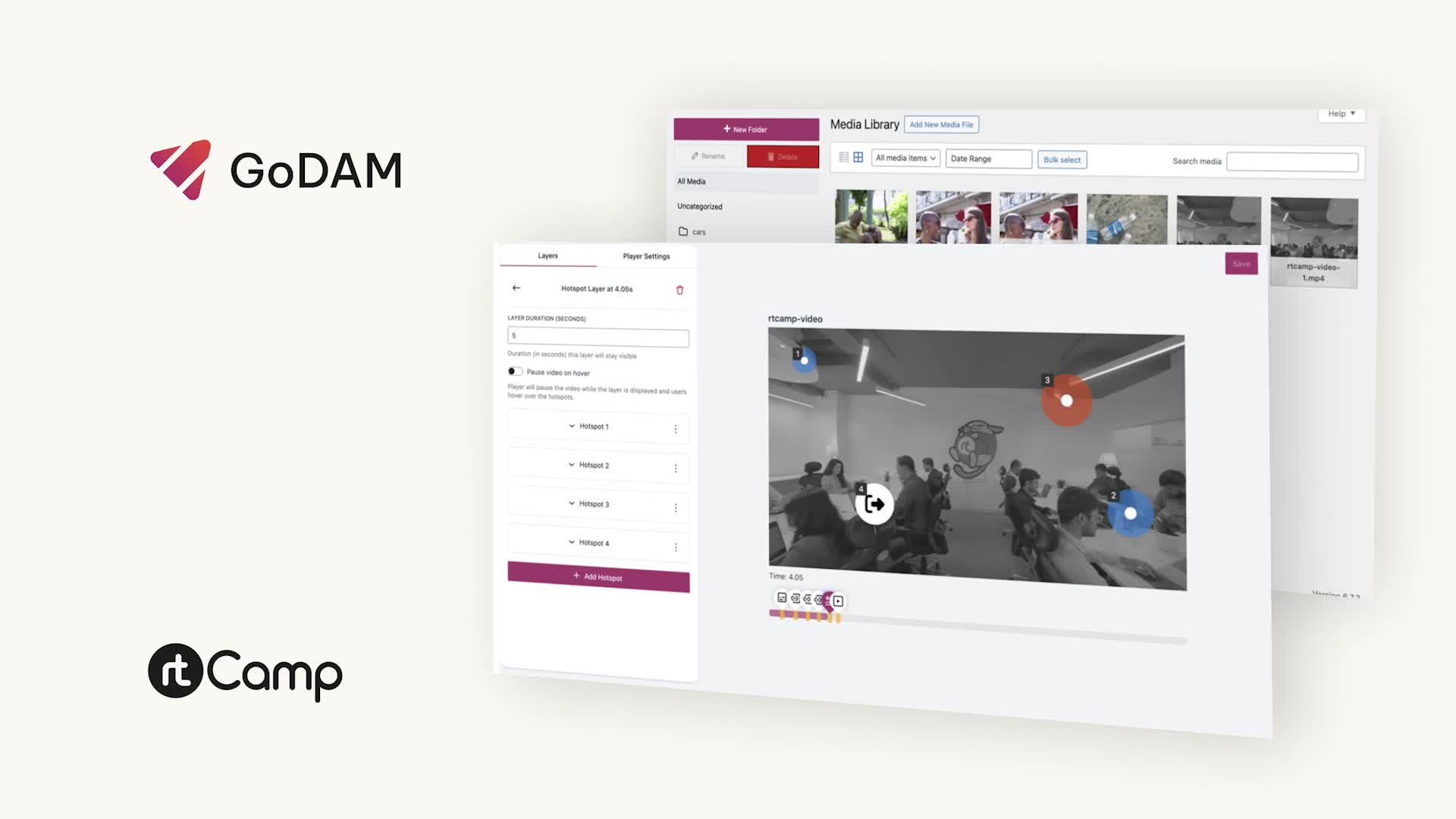 GoDAM is a media management service that seamlessly integrates with your WordPress site to optimize and enhance your audio and video content. It automatically converts uploaded audio files to MP3 and video files to MP4 formats. Additionally, GoDAM offers a suite of powerful features, including thumbnail generation, shortcode support, customizable video layers (like Gravity Forms, text/image CTAs, video hotspots, and ads), adaptive bitrate streaming for smooth playback, and advanced asset management tools.