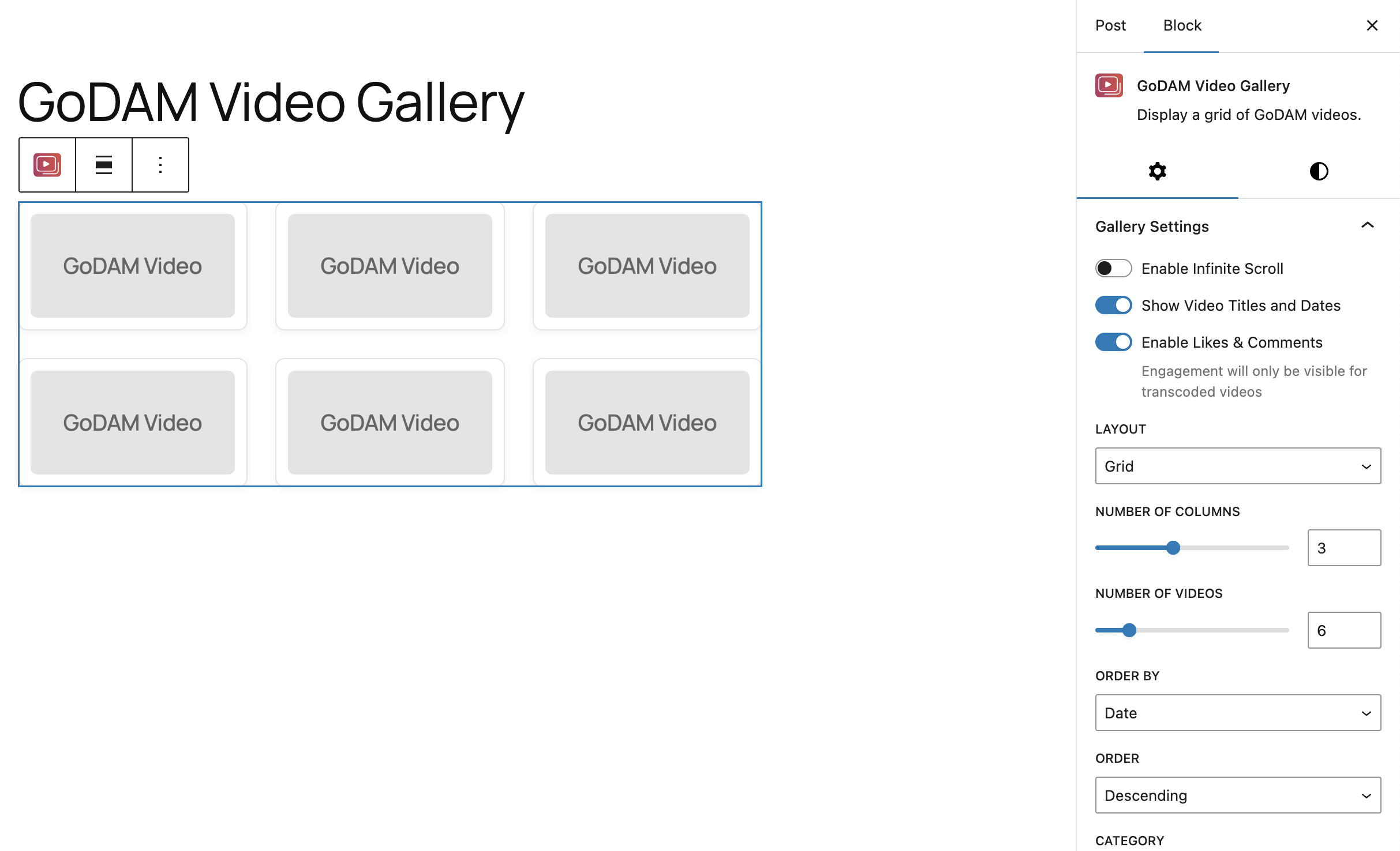 As you adjust settings, the block preview updates immediately with the skeleton of the output, showing placeholder videos that reflect your chosen layout and column settings.