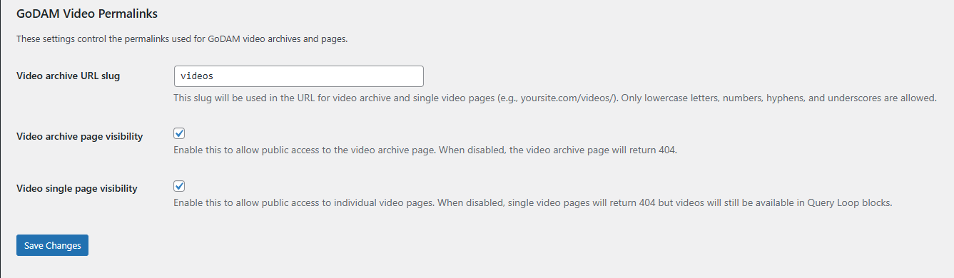 This feature will work if the user enables the Video single page visibility option. To do that, please go to the Settings->Permalinks. Under GoDAM Video Permalinks, check the Video single page visibility option.